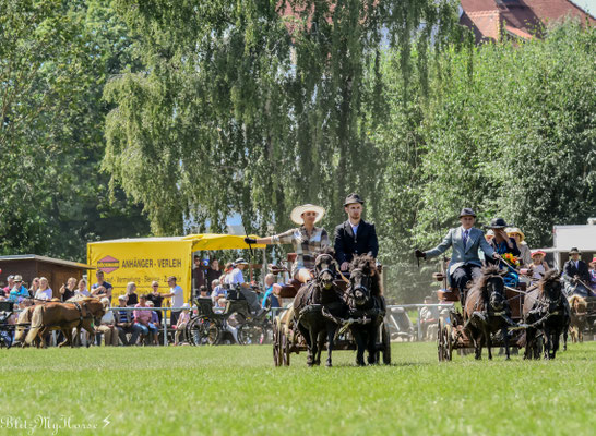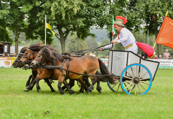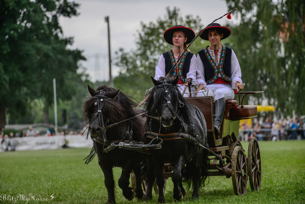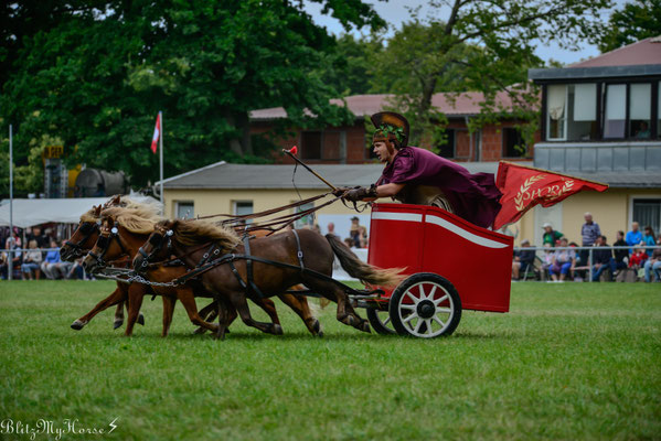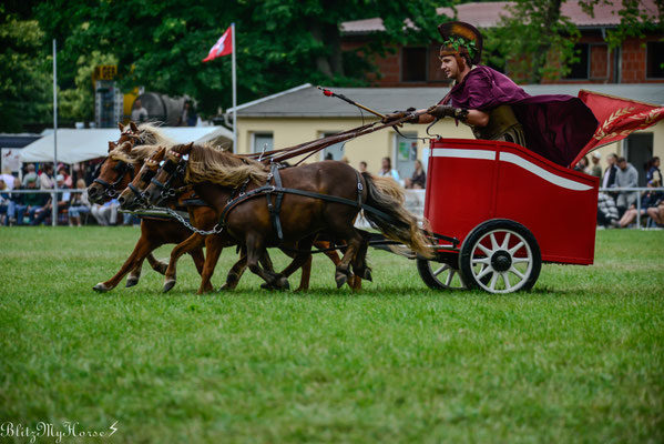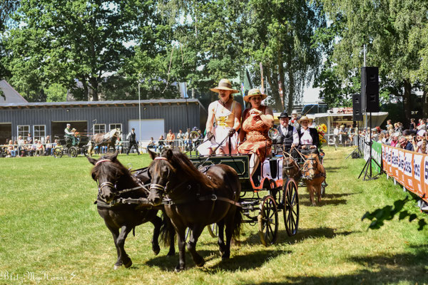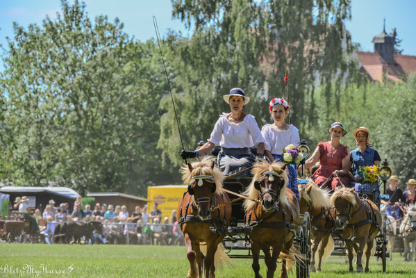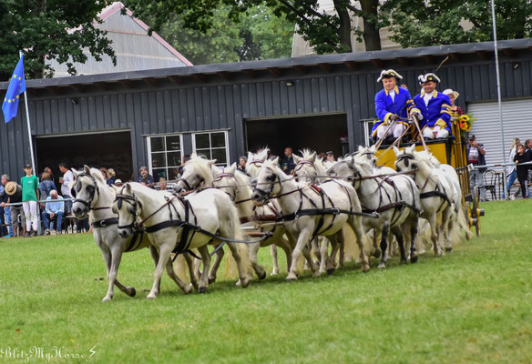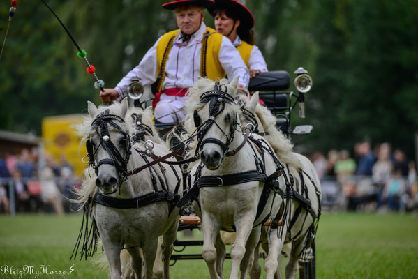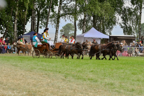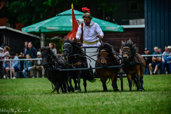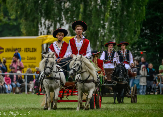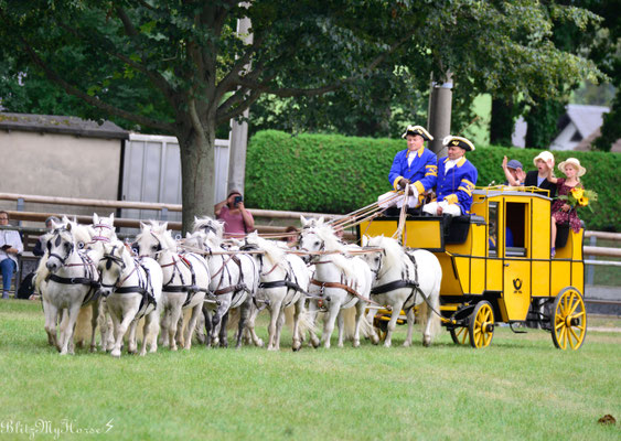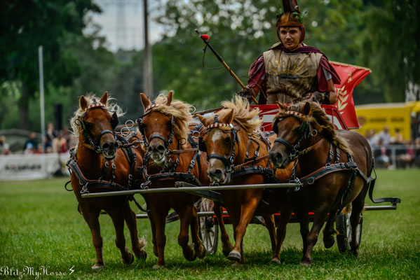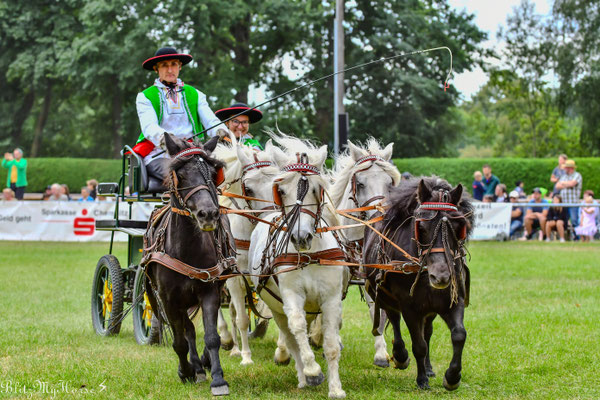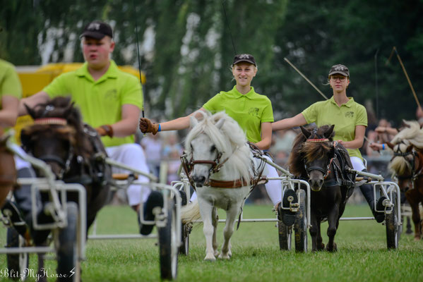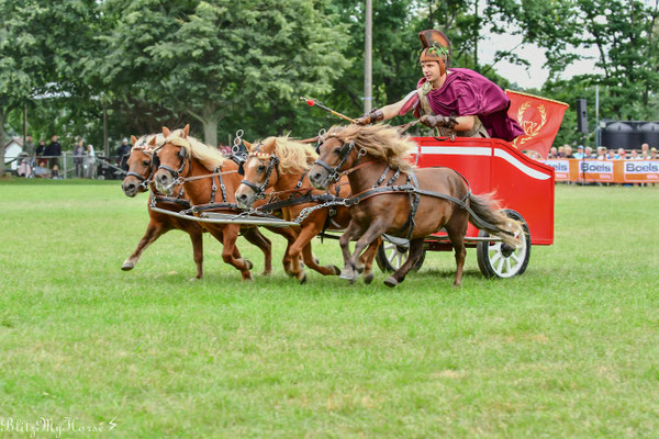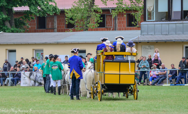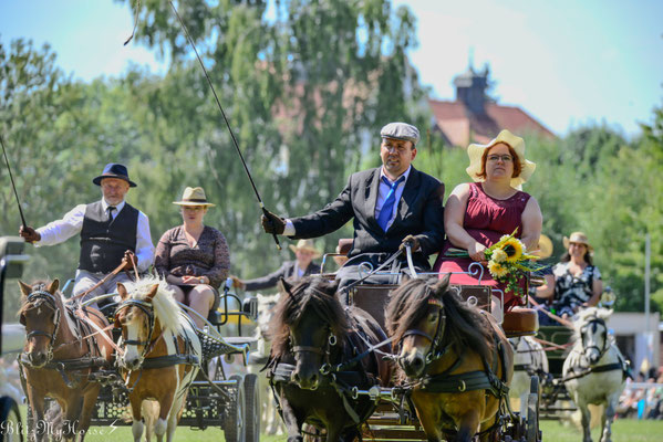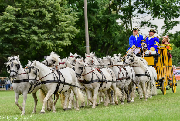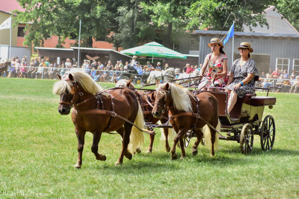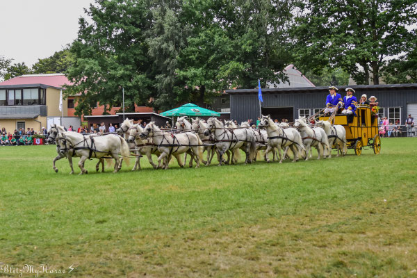 Die Einmarschparade mit ihren zahlreichen Ponygespannen und Kinderreitern eröffnete traditionell unsere Ponyschau. Es folgten weitere Programmnummern mit gefahrenen und gerittenen Quadrillen, rasanten Römer- und Streitwagen, süßen Fohlen, geschickten Reitern und imposanten Mehrspännern. Es wechselten sich traditionelle Programmnummern wie die Sulkyquadrille mit neuen Highlights wie den Ungarischen Impressionen mit rasanten Fünferzügen und der Ungarischen Post ab. Klarer Höhepunkt unserer Veranstaltung war die einwandfrei gefahrene Postkusche mit 16 Schimmeln vor dem Wagen.