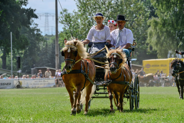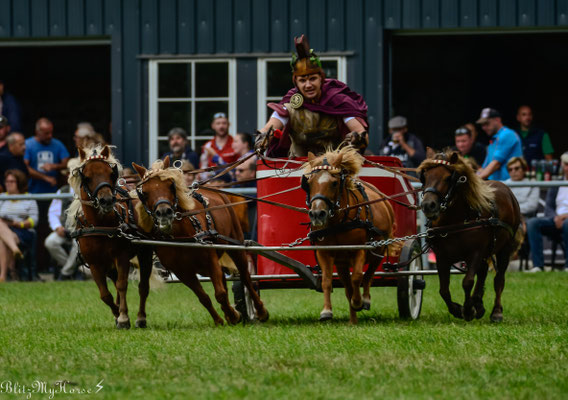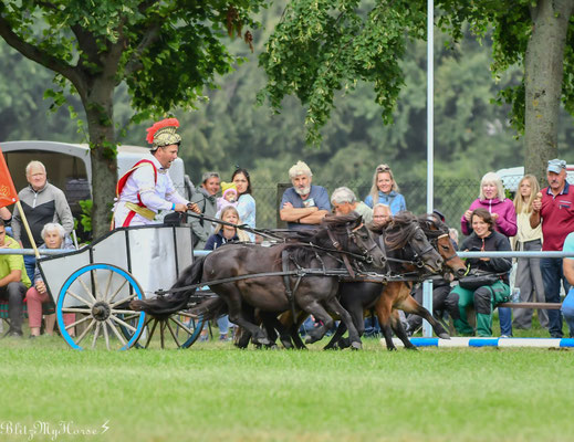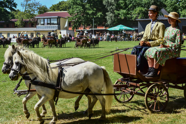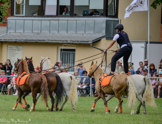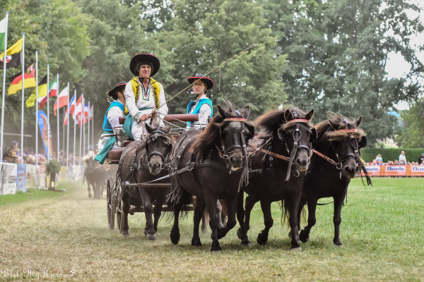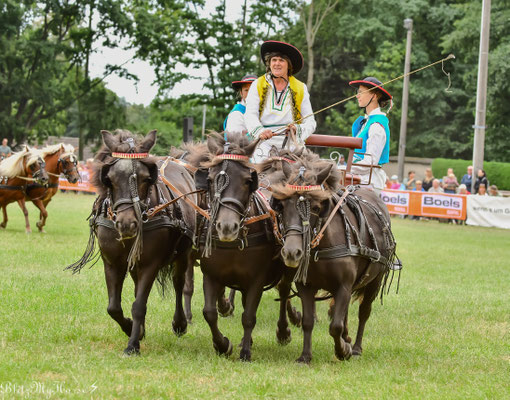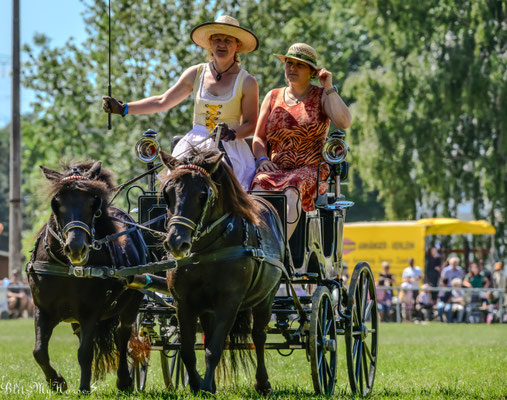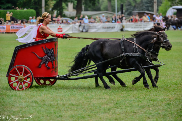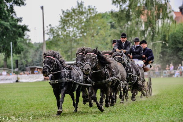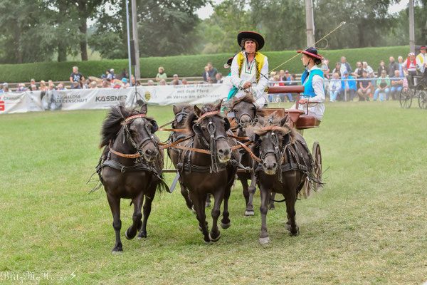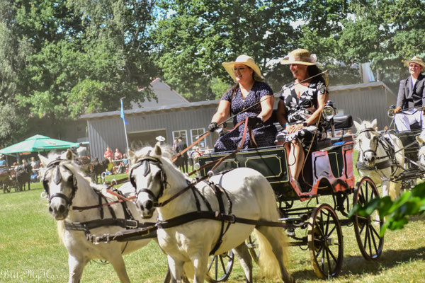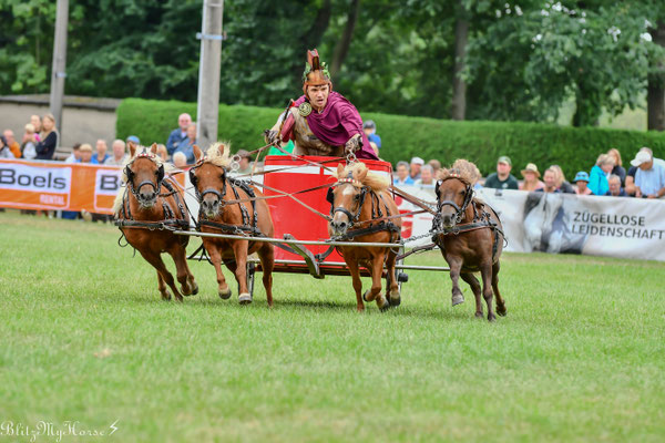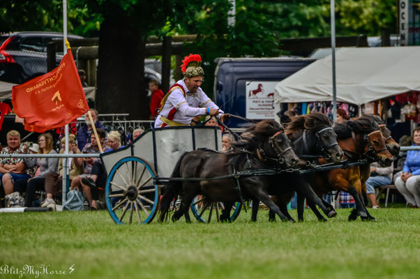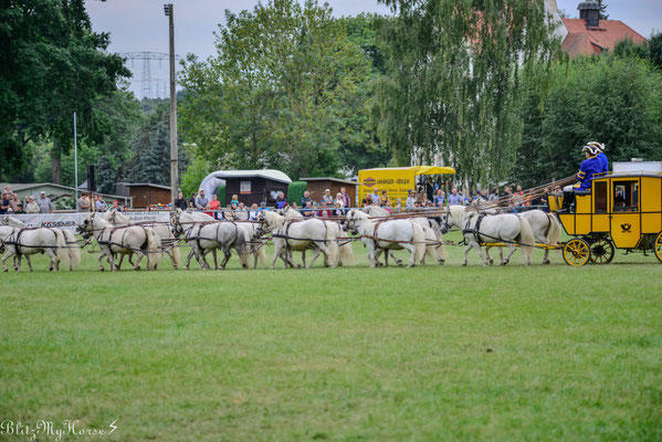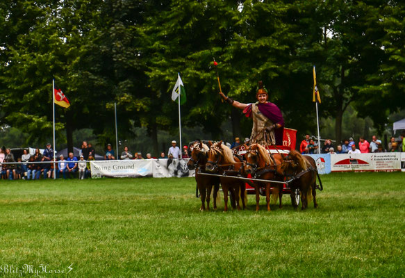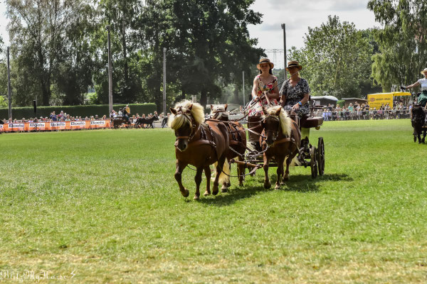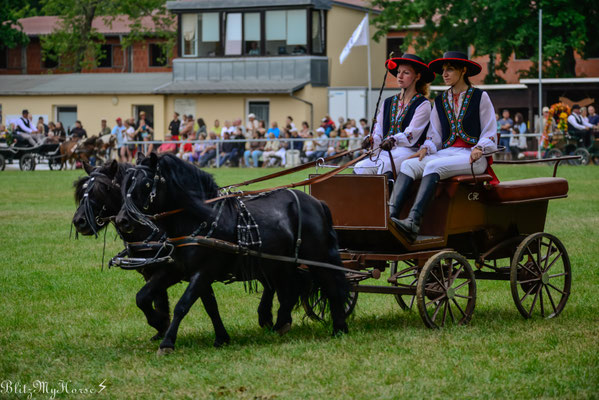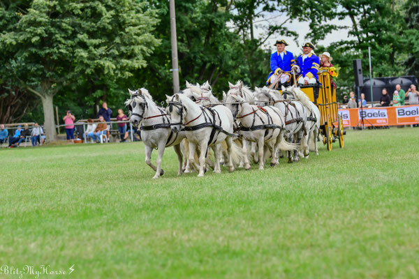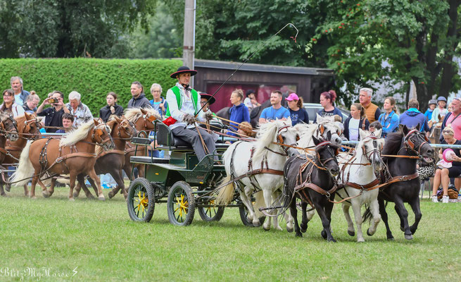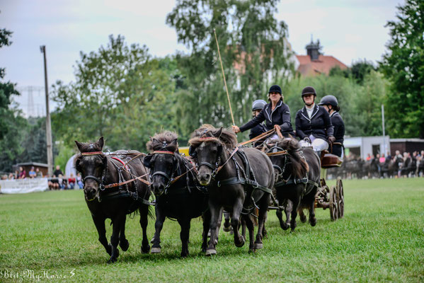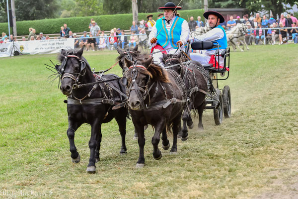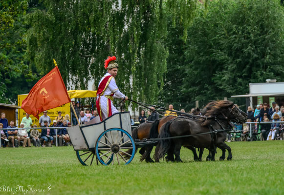 Die Einmarschparade mit ihren zahlreichen Ponygespannen und Kinderreitern eröffnete traditionell unsere Ponyschau. Es folgten weitere Programmnummern mit gefahrenen und gerittenen Quadrillen, rasanten Römer- und Streitwagen, süßen Fohlen, geschickten Reitern und imposanten Mehrspännern. Es wechselten sich traditionelle Programmnummern wie die Sulkyquadrille mit neuen Highlights wie den Ungarischen Impressionen mit rasanten Fünferzügen und der Ungarischen Post ab. Klarer Höhepunkt unserer Veranstaltung war die einwandfrei gefahrene Postkusche mit 16 Schimmeln vor dem Wagen.