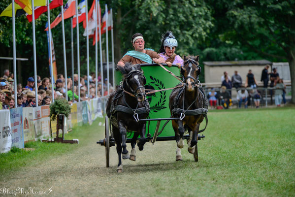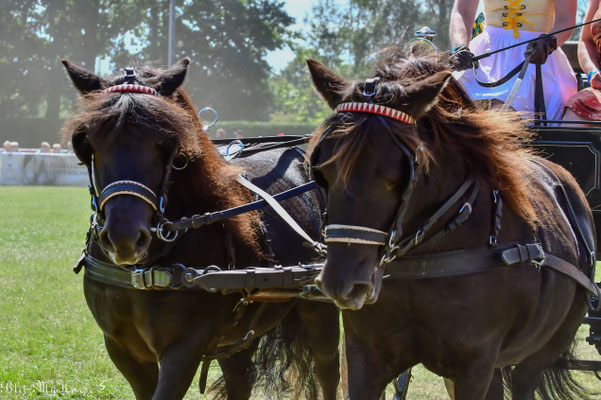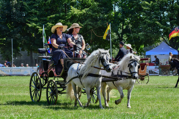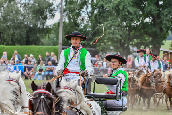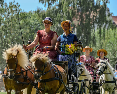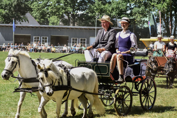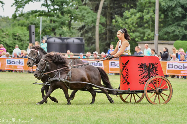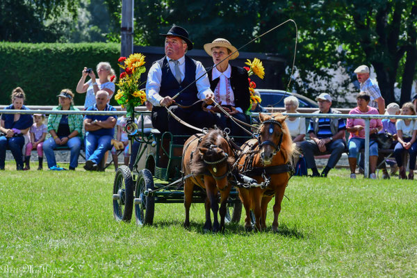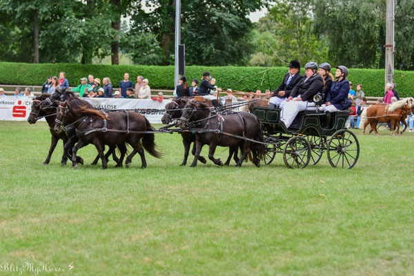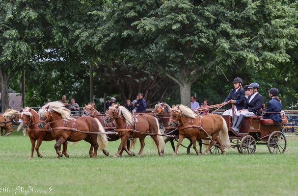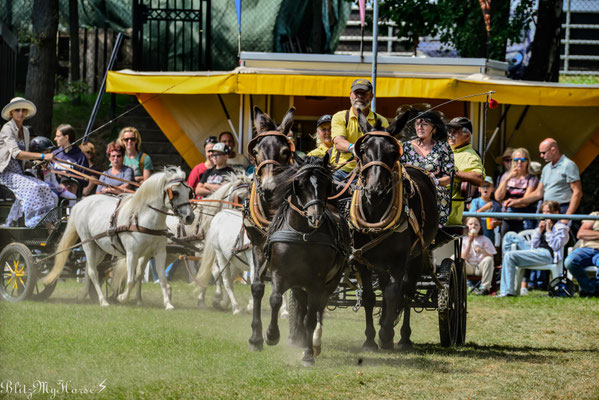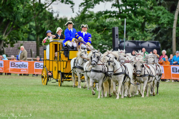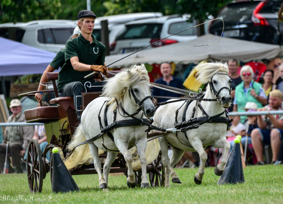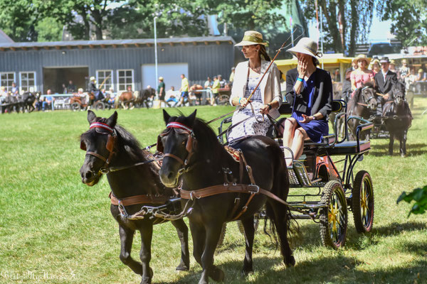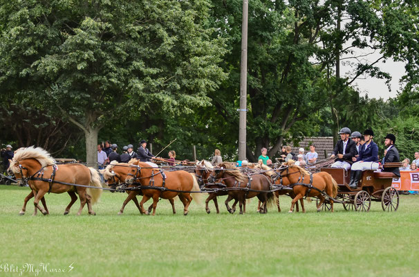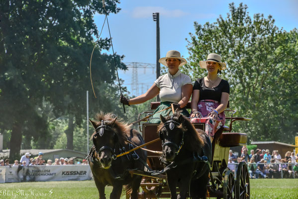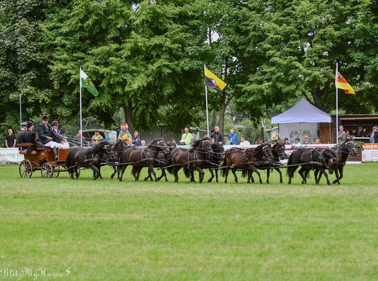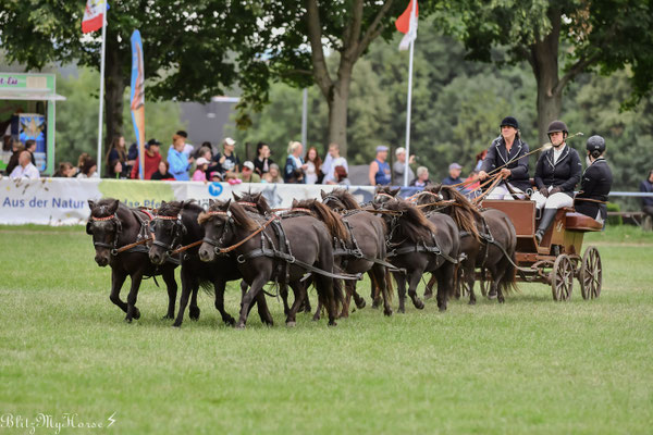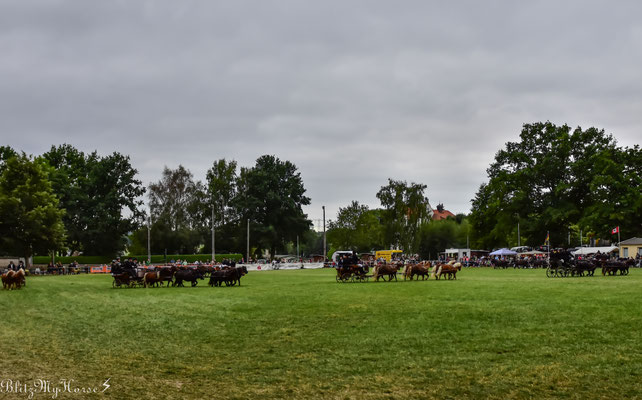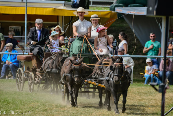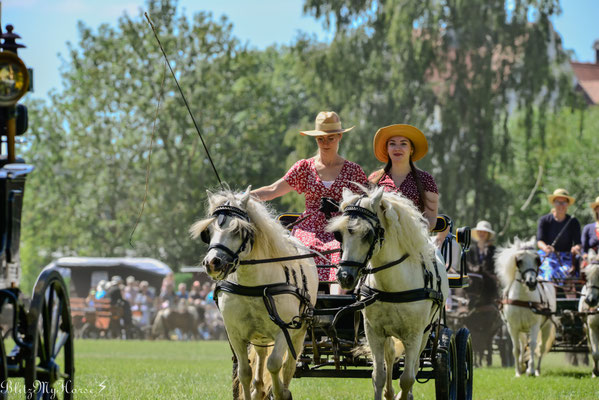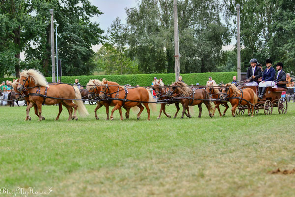 Die Einmarschparade mit ihren zahlreichen Ponygespannen und Kinderreitern eröffnete traditionell unsere Ponyschau. Es folgten weitere Programmnummern mit gefahrenen und gerittenen Quadrillen, rasanten Römer- und Streitwagen, süßen Fohlen, geschickten Reitern und imposanten Mehrspännern. Es wechselten sich traditionelle Programmnummern wie die Sulkyquadrille mit neuen Highlights wie den Ungarischen Impressionen mit rasanten Fünferzügen und der Ungarischen Post ab. Klarer Höhepunkt unserer Veranstaltung war die einwandfrei gefahrene Postkusche mit 16 Schimmeln vor dem Wagen.