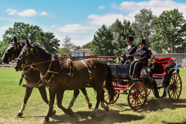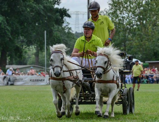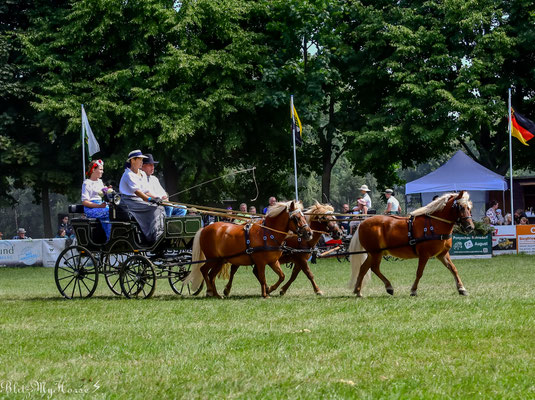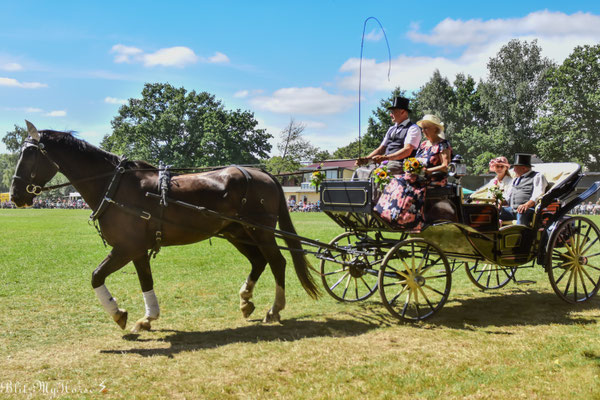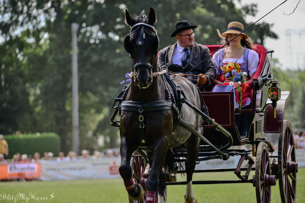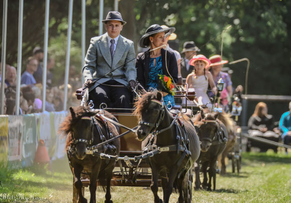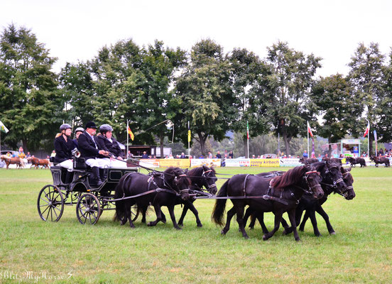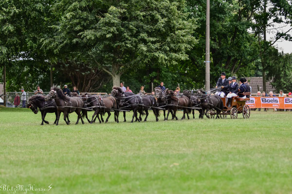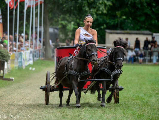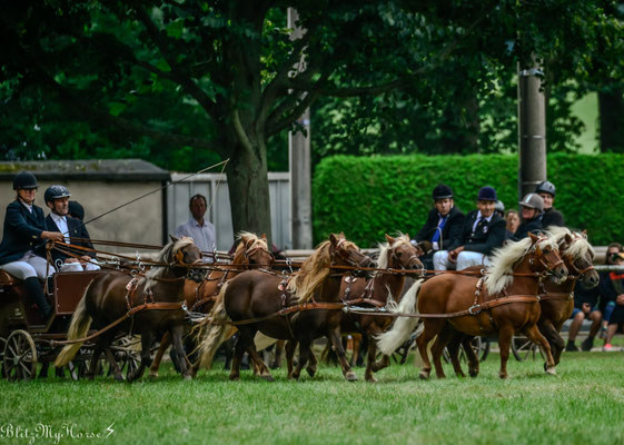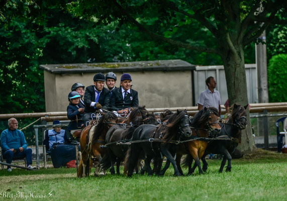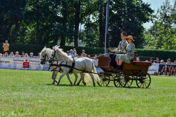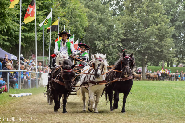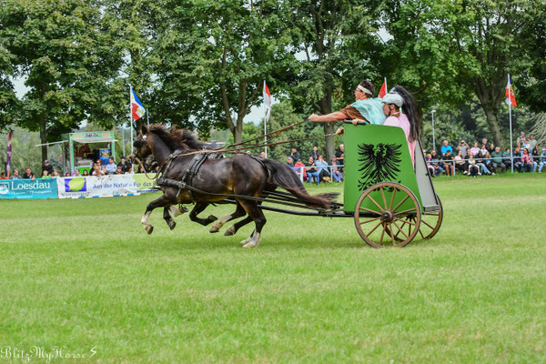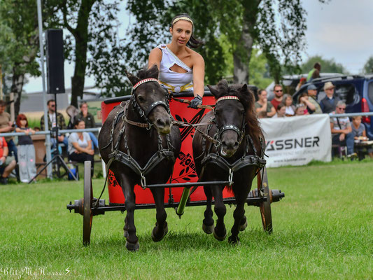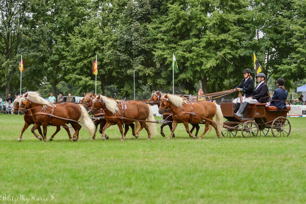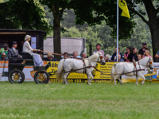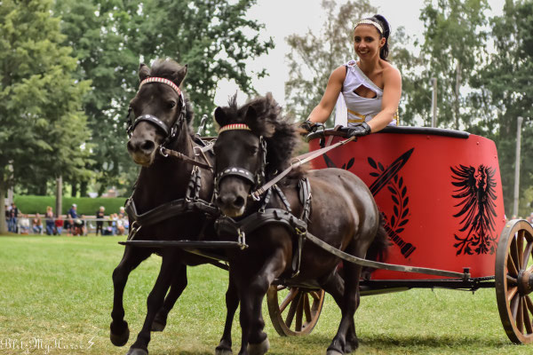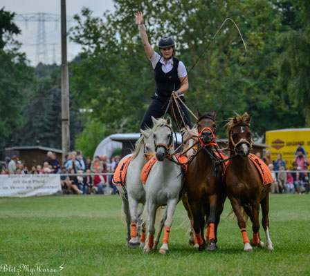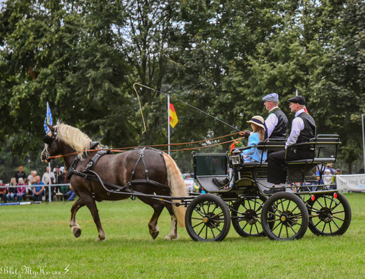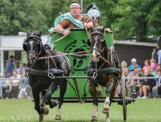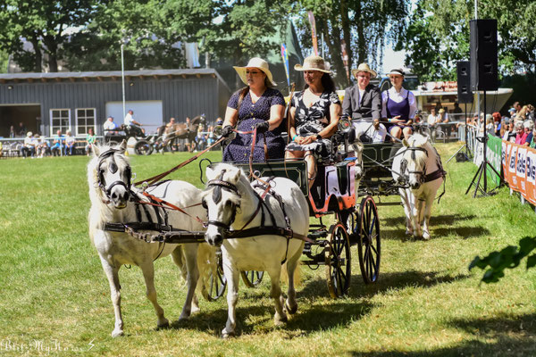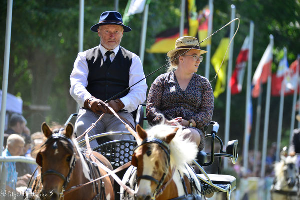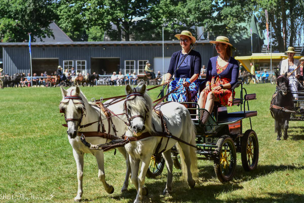 Die Einmarschparade mit ihren zahlreichen Ponygespannen und Kinderreitern eröffnete traditionell unsere Ponyschau. Es folgten weitere Programmnummern mit gefahrenen und gerittenen Quadrillen, rasanten Römer- und Streitwagen, süßen Fohlen, geschickten Reitern und imposanten Mehrspännern. Es wechselten sich traditionelle Programmnummern wie die Sulkyquadrille mit neuen Highlights wie den Ungarischen Impressionen mit rasanten Fünferzügen und der Ungarischen Post ab. Klarer Höhepunkt unserer Veranstaltung war die einwandfrei gefahrene Postkusche mit 16 Schimmeln vor dem Wagen.